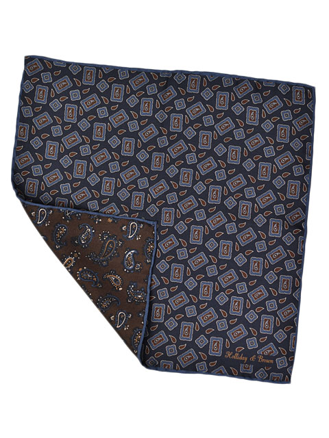 Holliday&Brown【ホリデーアンドブラウン】チーフ 4472 35570 1 ダブルプリント シルク ジオメトリック ネイビー×ブルー