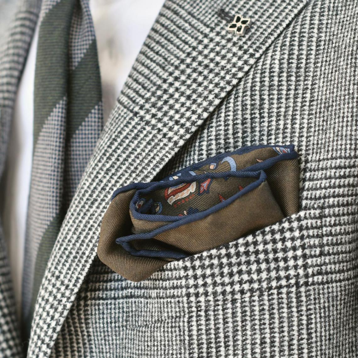 そんな同ブランドよりご紹介するのは、表裏にそれぞれ異なるプリントを施したチーフでございます。