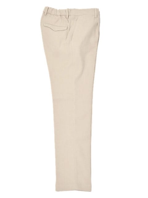 シルエットは細すぎず腰回りはややリラックス感のある印象ですが、膝から裾のテーパードが程よく効いており、モダンな仕上がりに。