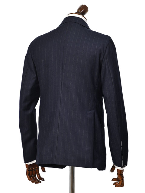 上質なSUPER110'Sヴァージンウールを用いたサキソニー素材のネイビーストライプ。暖かみがあり、洒落た印象も持ち合わせたチョークストライプスーツは秋冬のビジネスシーンに大変オススメです。