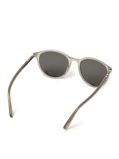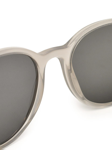 オパールグレーのフレームとダークグレーのレンズが絶妙にマッチ。中性的なフレームデザインと相まって、優しい印象です。