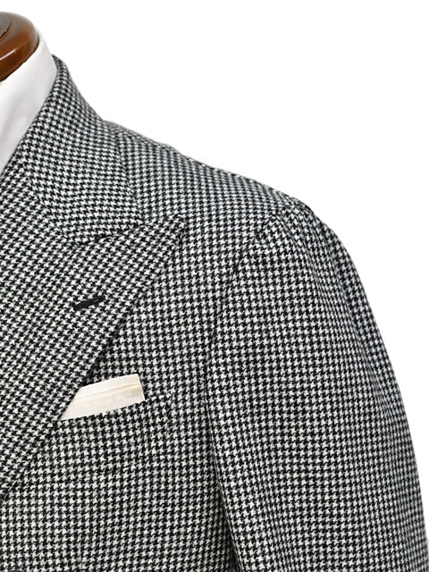 ナポリブランドらしい曲線美や、迫力あるラペル幅、袖の雨降らしといった伝統的なディテールが特徴的。