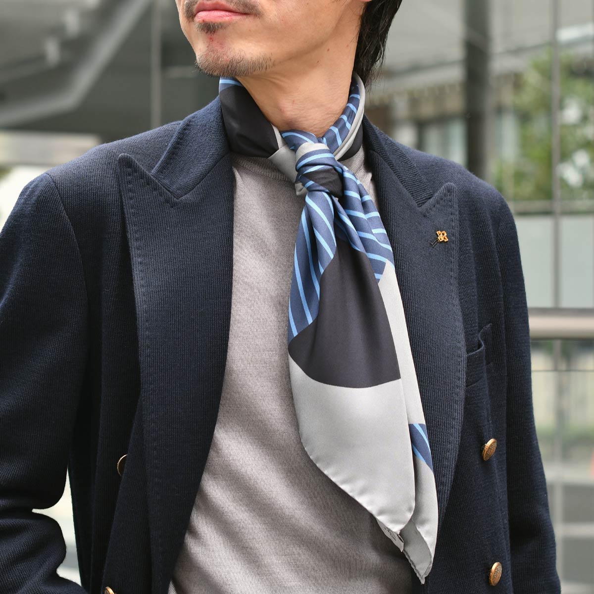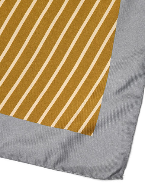 約90cm四方のスカーフには十分なインパクトがあり、シンプルな装いの味付けにオススメです。