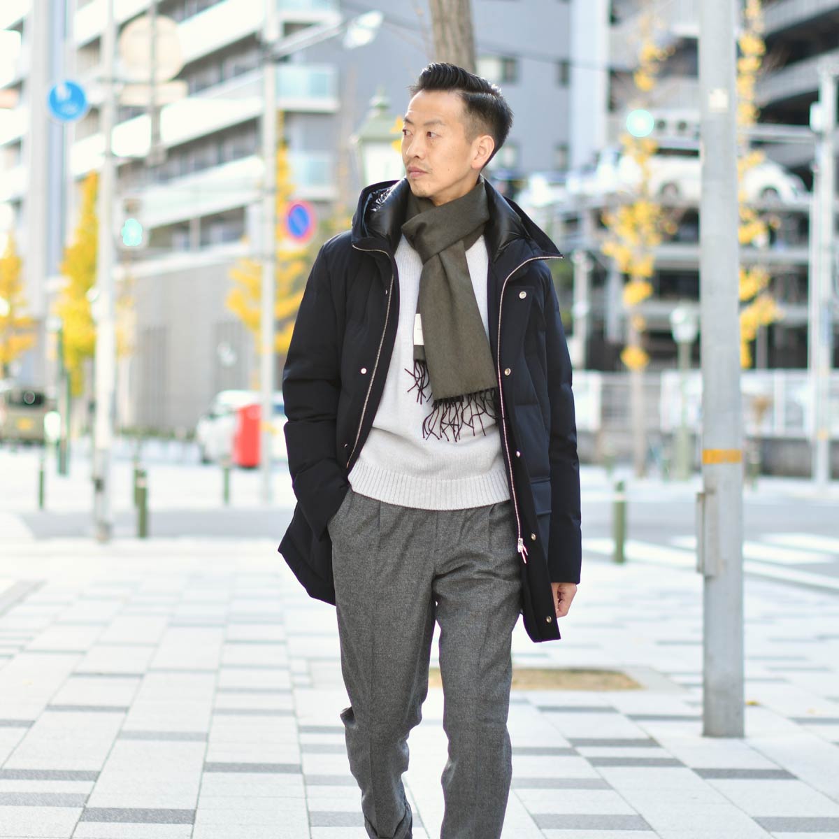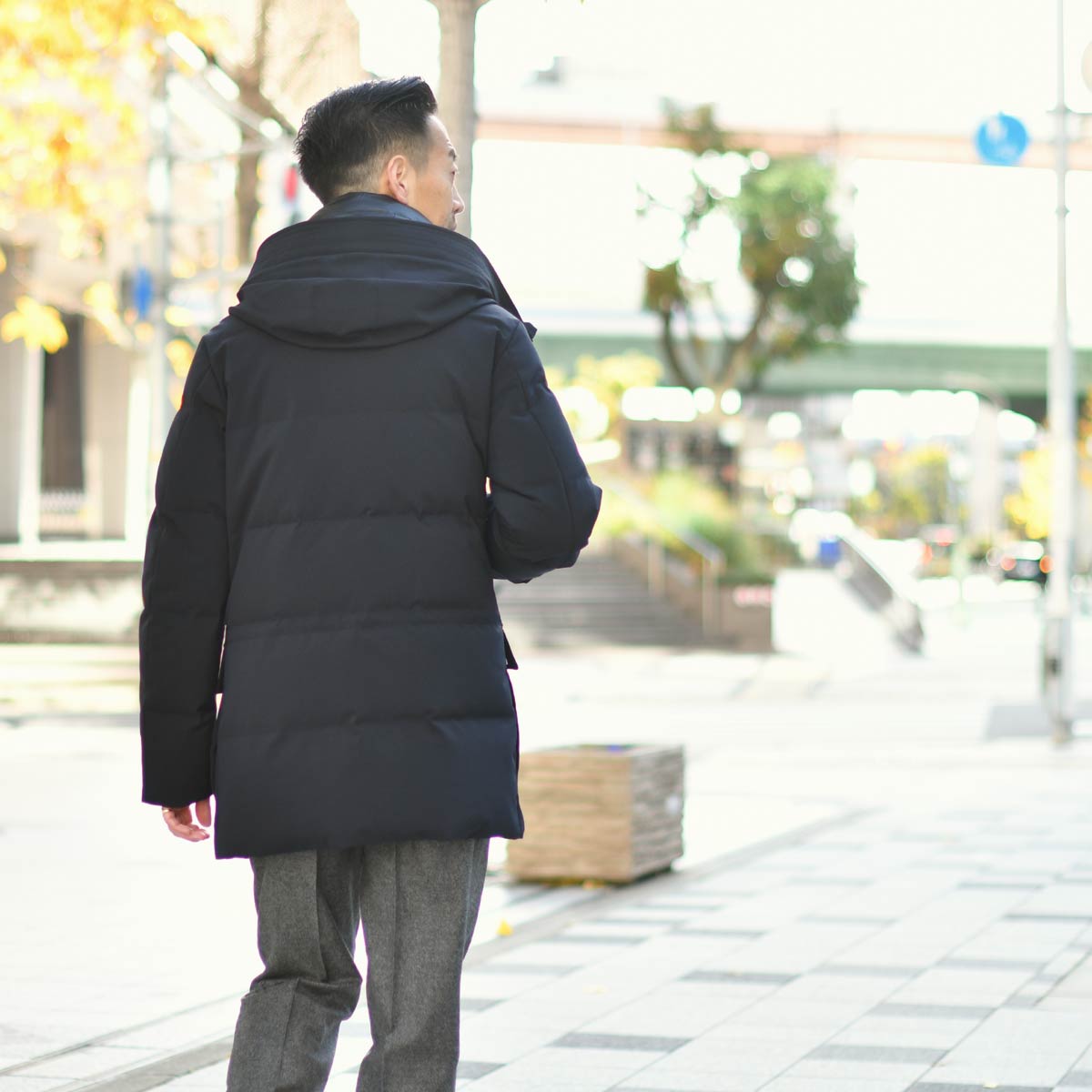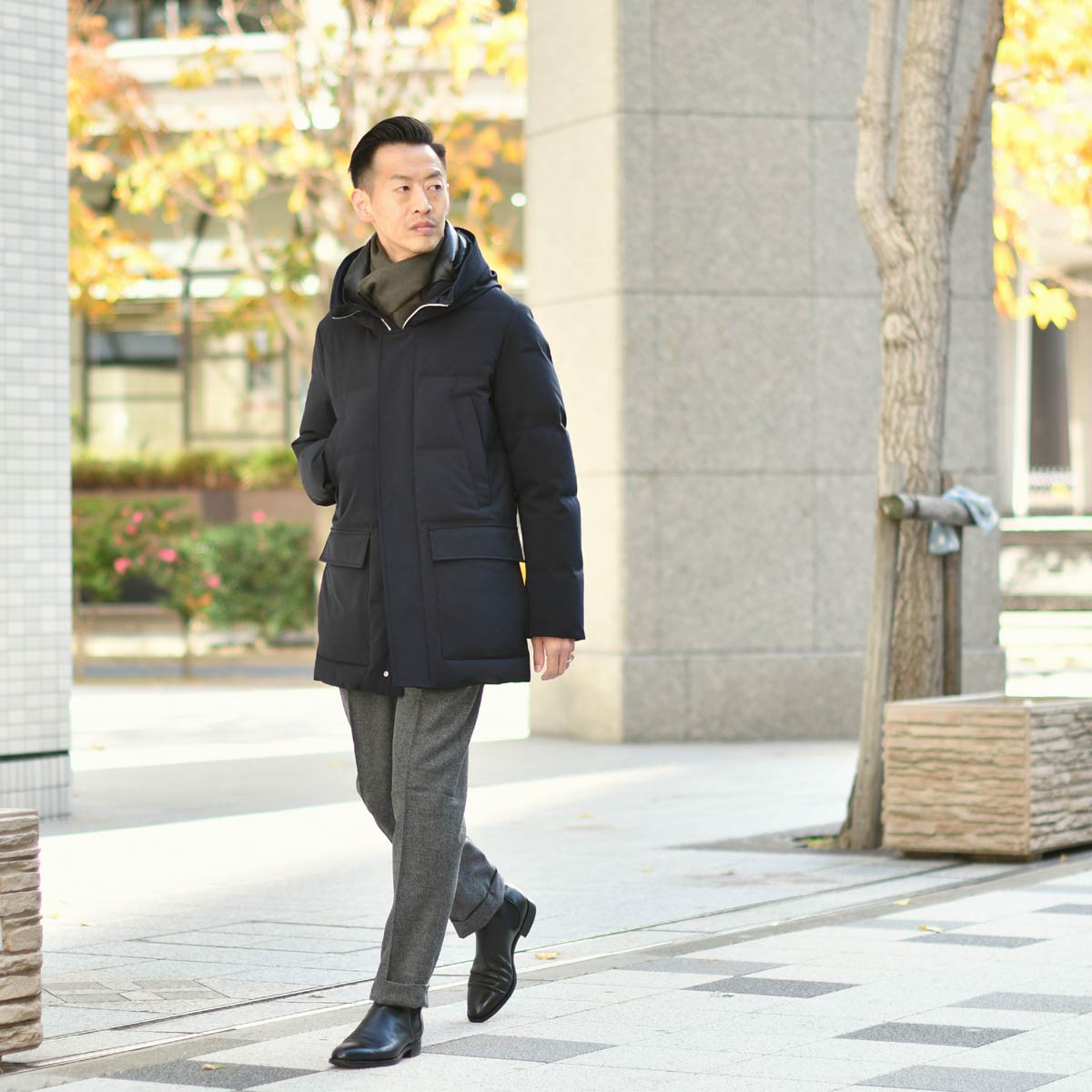 カジュアルなイメージが強いフード付きのダウンコートを、イタリアのブランドらしく