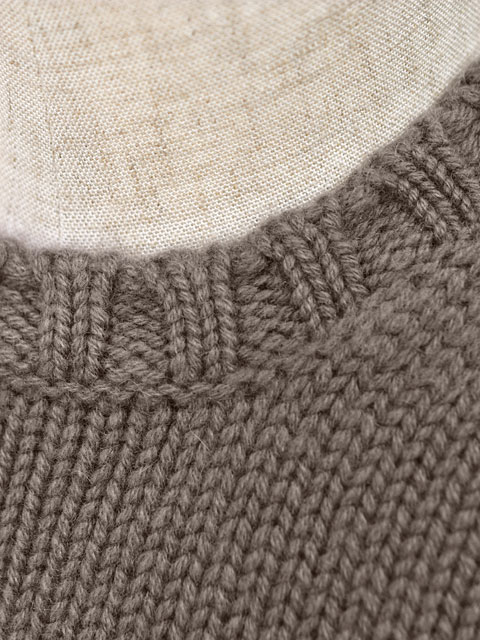 デザインは袖、襟、裾をリブ編みに切り替える事で、1枚としての見た目にも表情が出てサマになりますが、今季はネッカチーフやスカーフを巻くのもアリ。