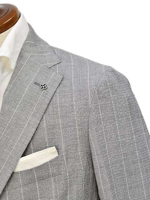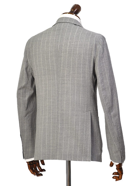 こちらはヴァージンウール素材のシアサッカー。ウールのしなやかさとエアリーな表情が魅力的。シワを気にすることなく日常使いができる一着はこの夏の必須アイテムです。ストレッチも効いていることから着用時も快適。