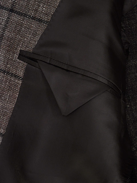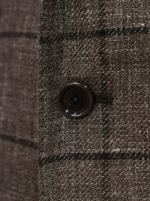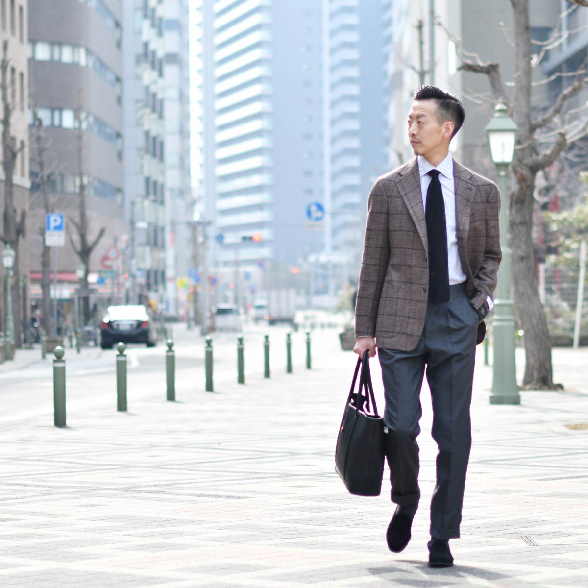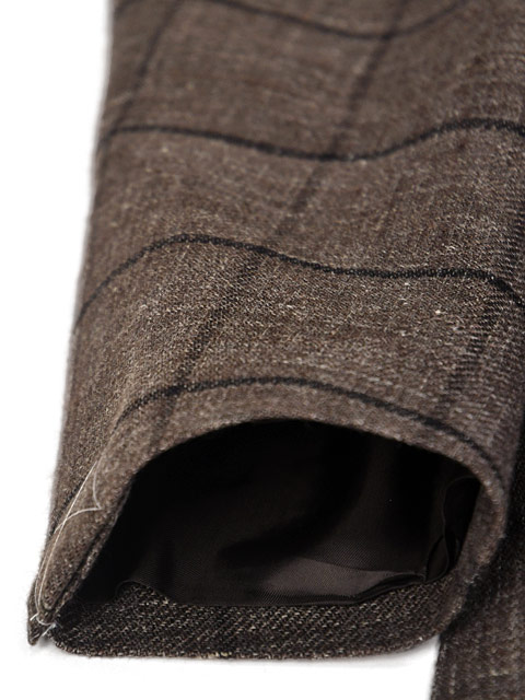 ブラウンをベースにブラックのペーンを走らせた生地は、シューズ、バッグなどを選ぶ際にどちらも合わせられますので、コーディネートにも困らず合わせやすい1着。