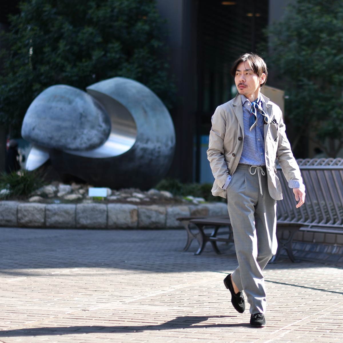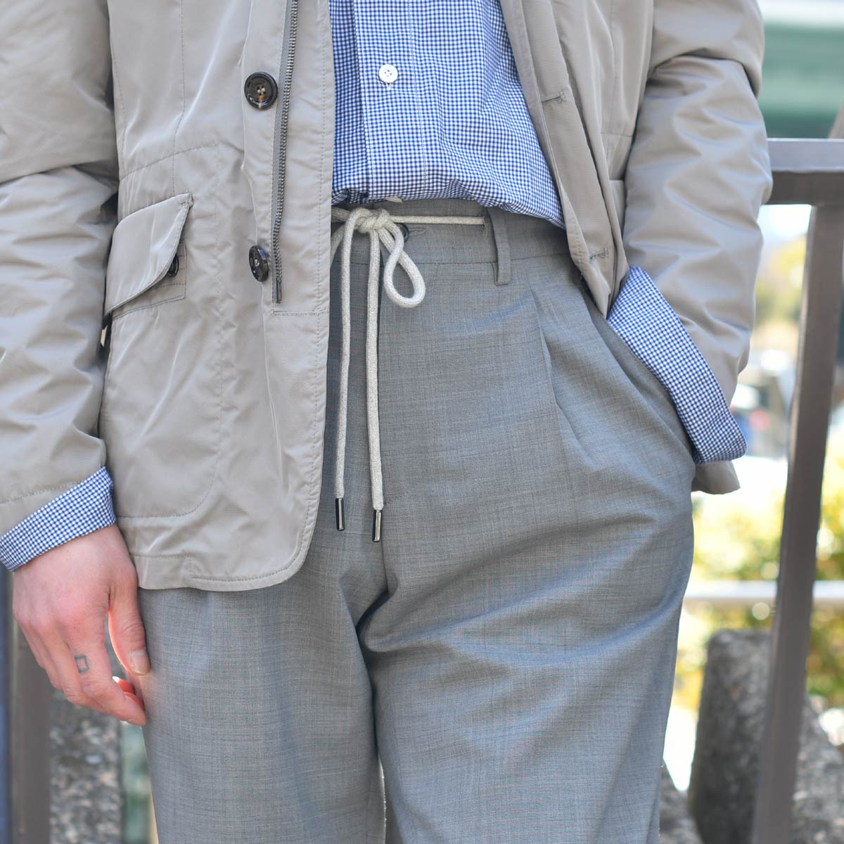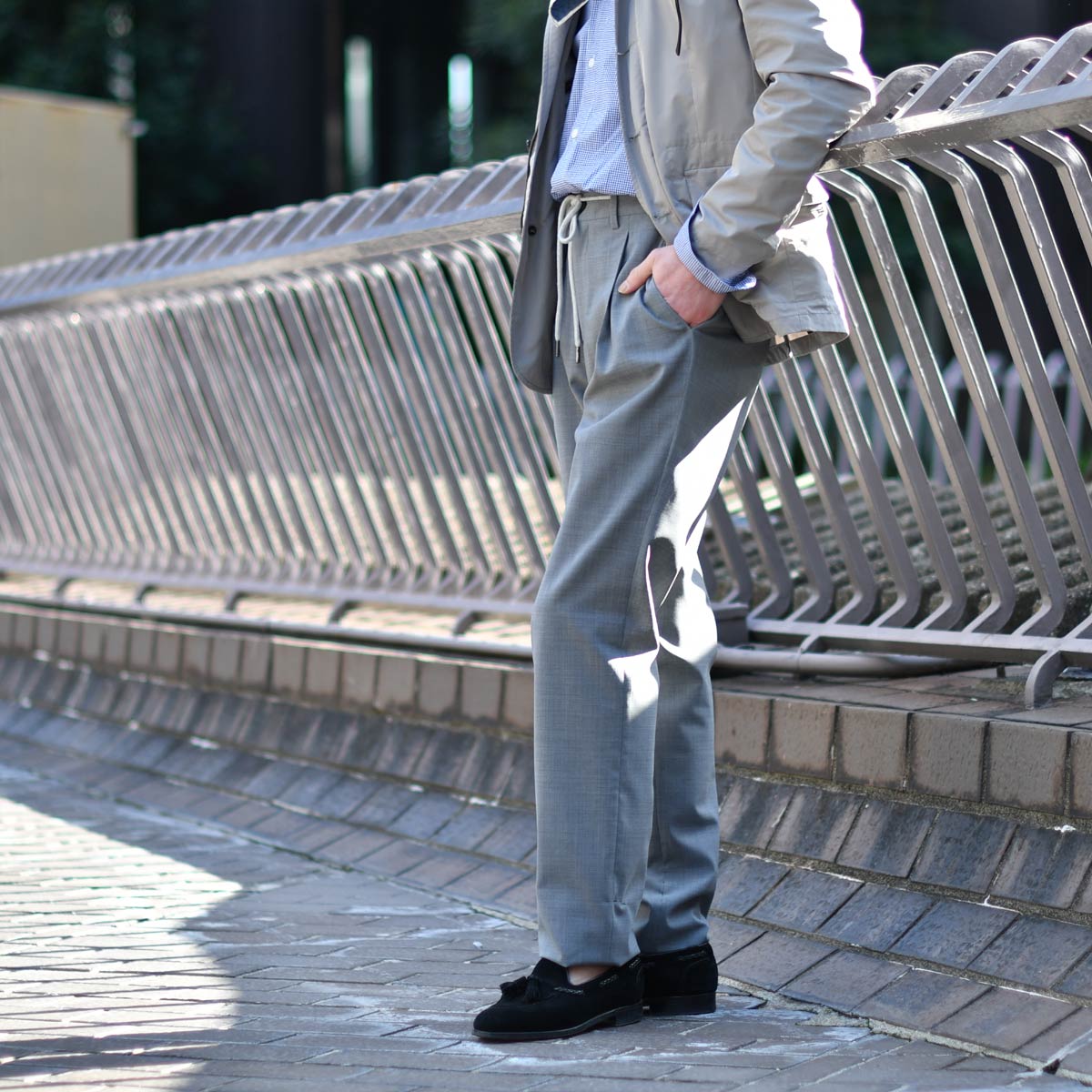 パンツの素材には、春夏シーズンに着用がしやすいサラッとしたウールとポリエステルをブレンドしたものを。