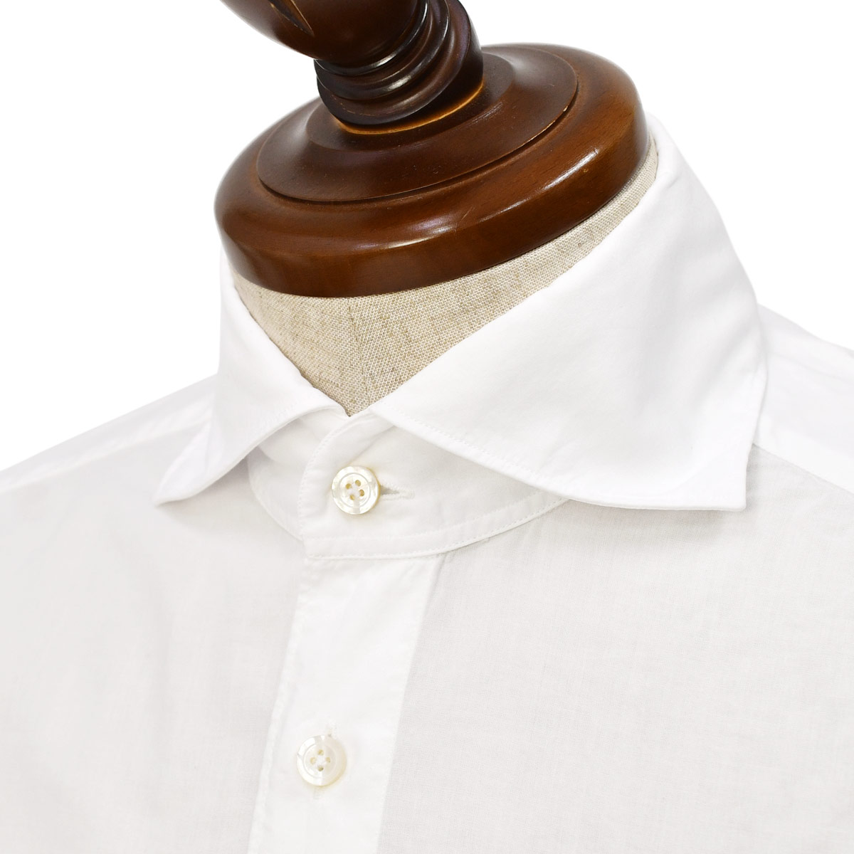 SERGIO【セルジオ】の特徴である台襟の高さはそのままに、襟の開きをSIMONE【シモーネ】の角度に抑える事により、カーディガンやジャケットのインナーにも収まりがよくなりました。