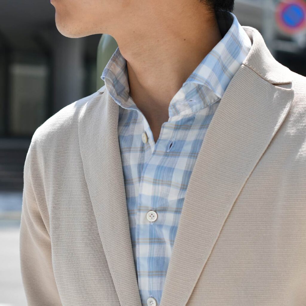 SERGIO【セルジオ】の特徴である台襟の高さはそのままに、襟の開きをSIMONE【シモーネ】の角度に抑える事により、カーディガンやジャケットのインナーにも収まりがよくなりました。