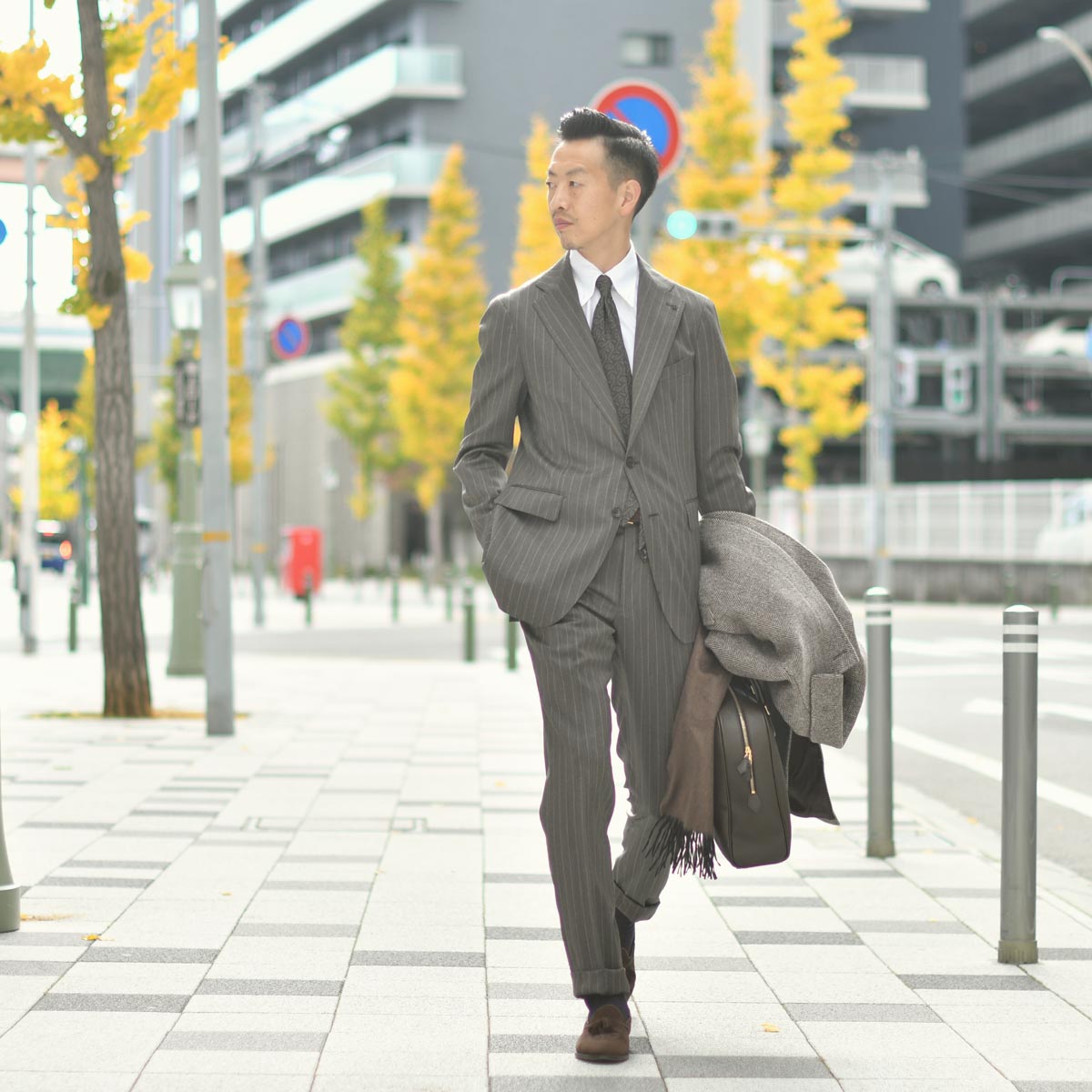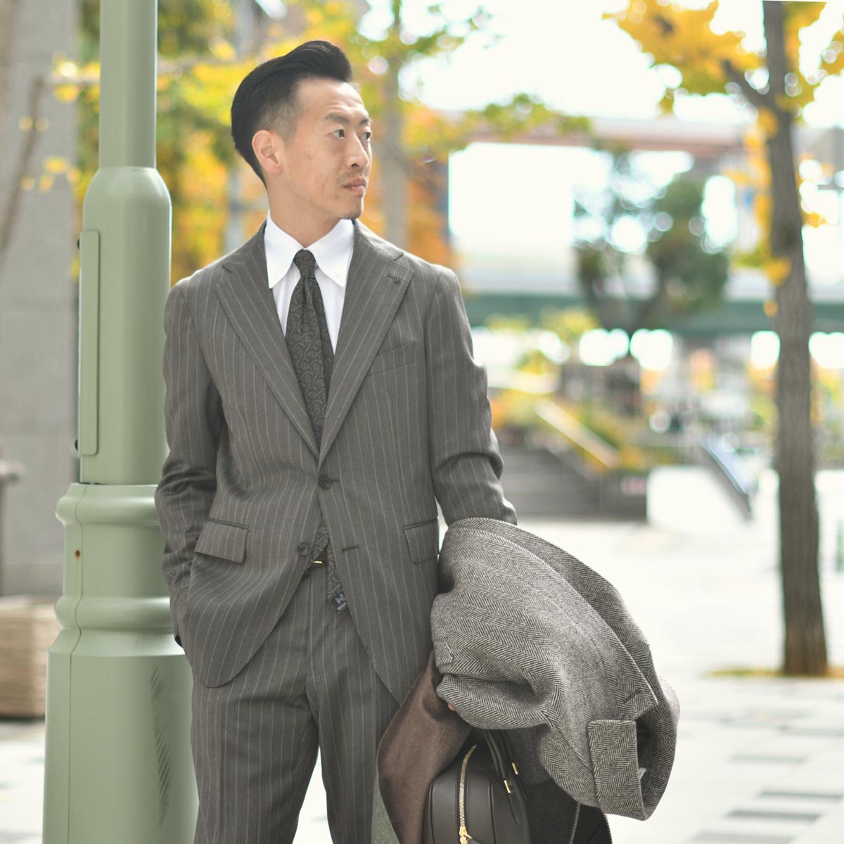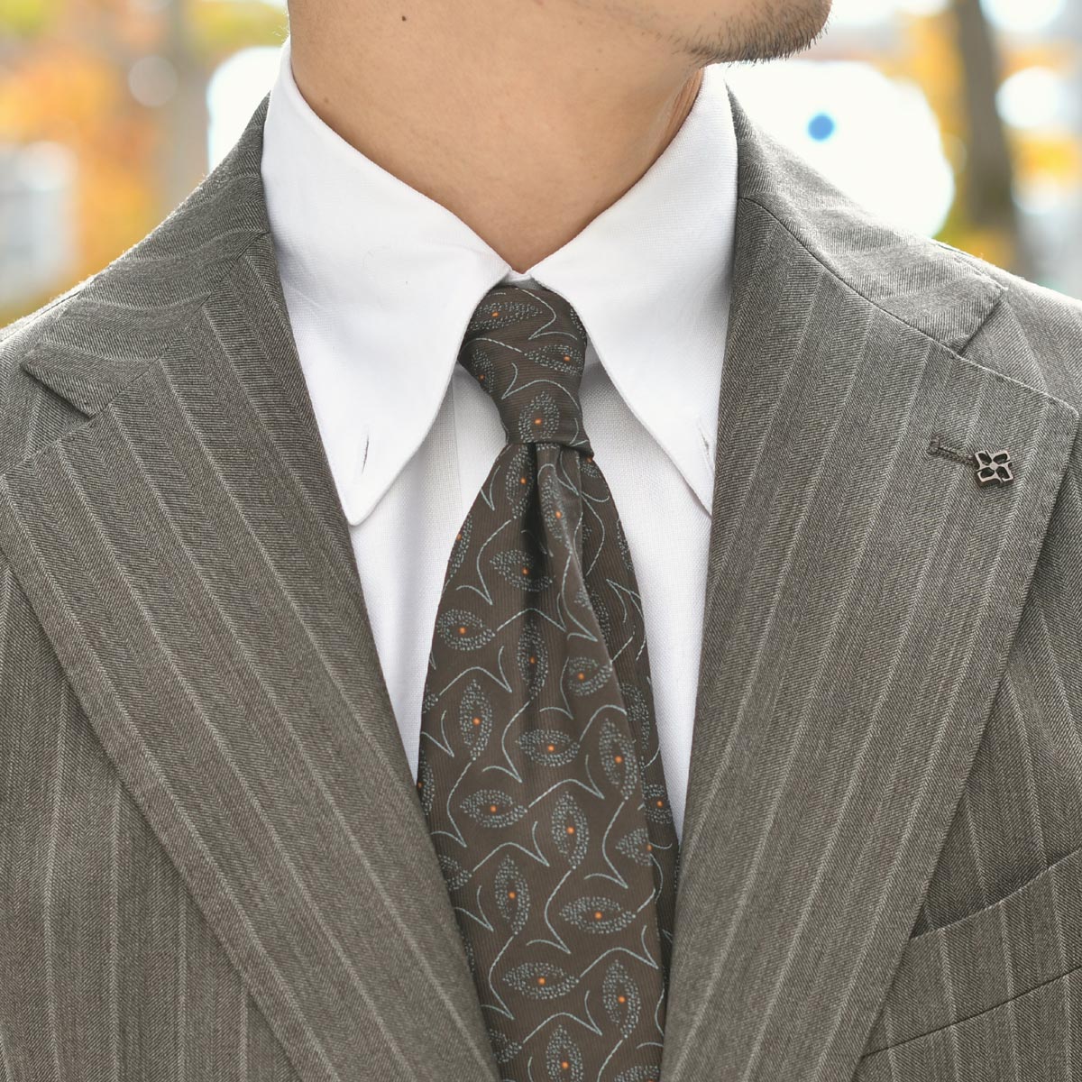グレイッシュなブラウンが放つ独特の落ち着いた雰囲気が渋い一着。