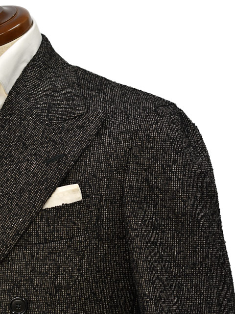 ナポリブランドらしい曲線美や、迫力あるラペル幅、袖の雨降らしといった伝統的なディテールが特徴的。