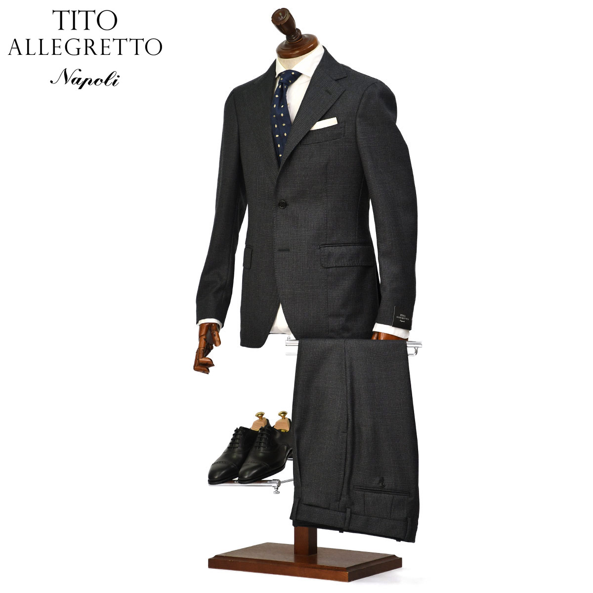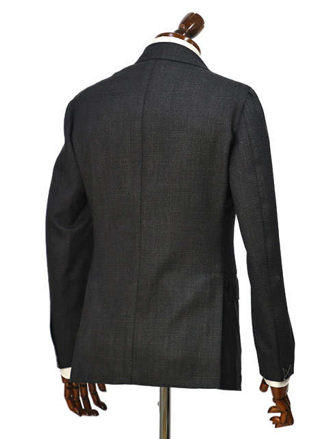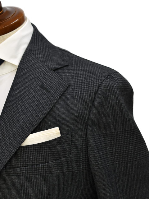 ナポリブランドらしい曲線美や、迫力あるラペル幅、袖の雨降らしといった伝統的なディテールが特徴的。