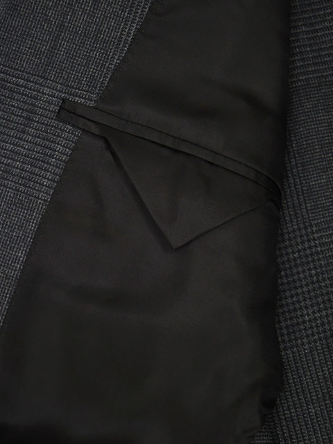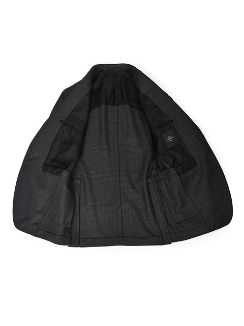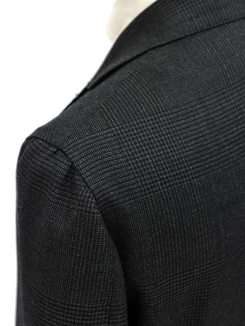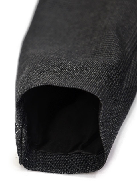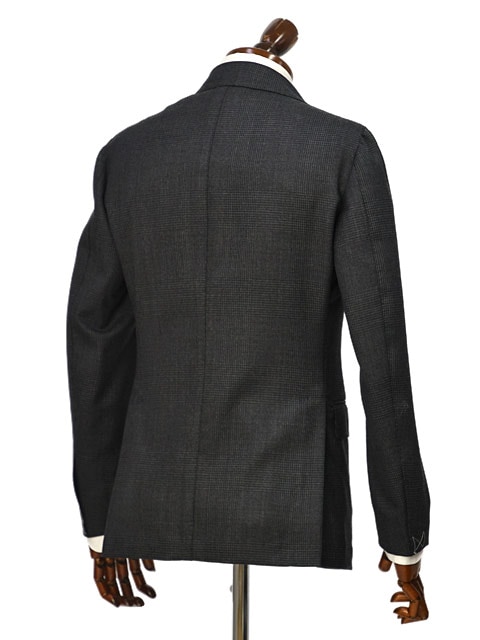 ハーフキャンバス(肩パッド有) 3ボタン段返り 袖口アンフィニッシュド(袖口用付属ボタン9個) サイドベンツ フラップポケット ラペル幅約10cm ワンプリーツ 裾未処理 目付: 360g |