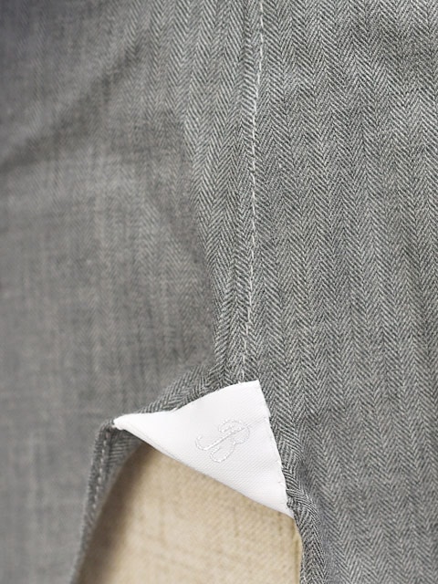 細やかなディテールについても抜かりはなく、後付けによる袖付けをはじめ、鳥足ボタン付け、ガゼット(前身頃と後見頃を補強する為の布)、剣ボロ(カンヌキ止め)、といった重要箇所は、すべて職人の手作業によって縫製されています。