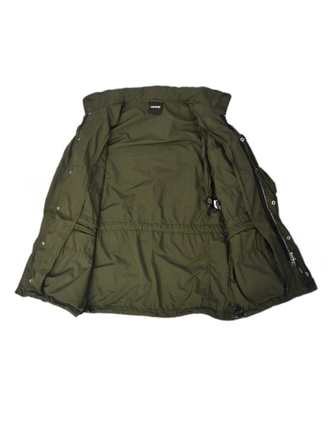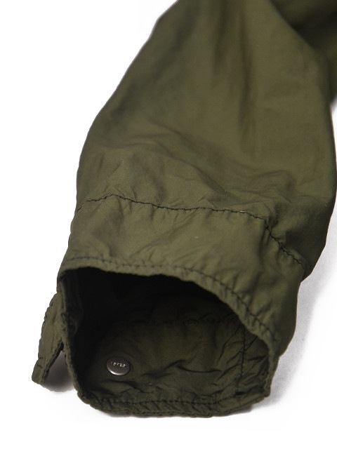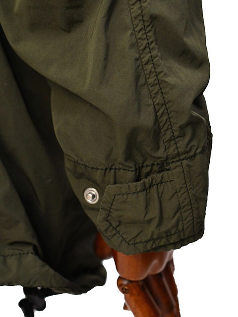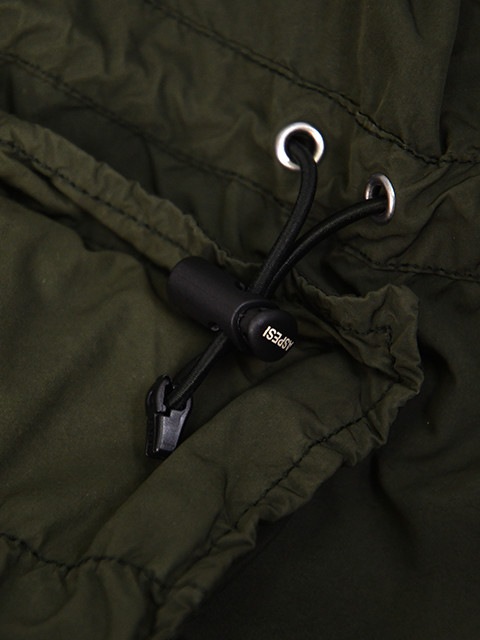 チンストラップ付スタンドカラー(フード襟収納) エポレット フラップ付ポケット(スナップ留め) ウエストと裾のドローコード |
